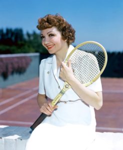 Claudette Colbert wearing her tennis whites while she prepares to hit the court, around 1930.