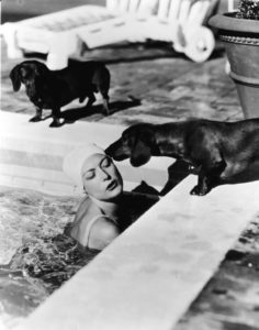Joan Crawford greets her dachshunds while making laps in her Beverly Slopes pool in the year 1938. Another addition to vintage photo collection of celebrities